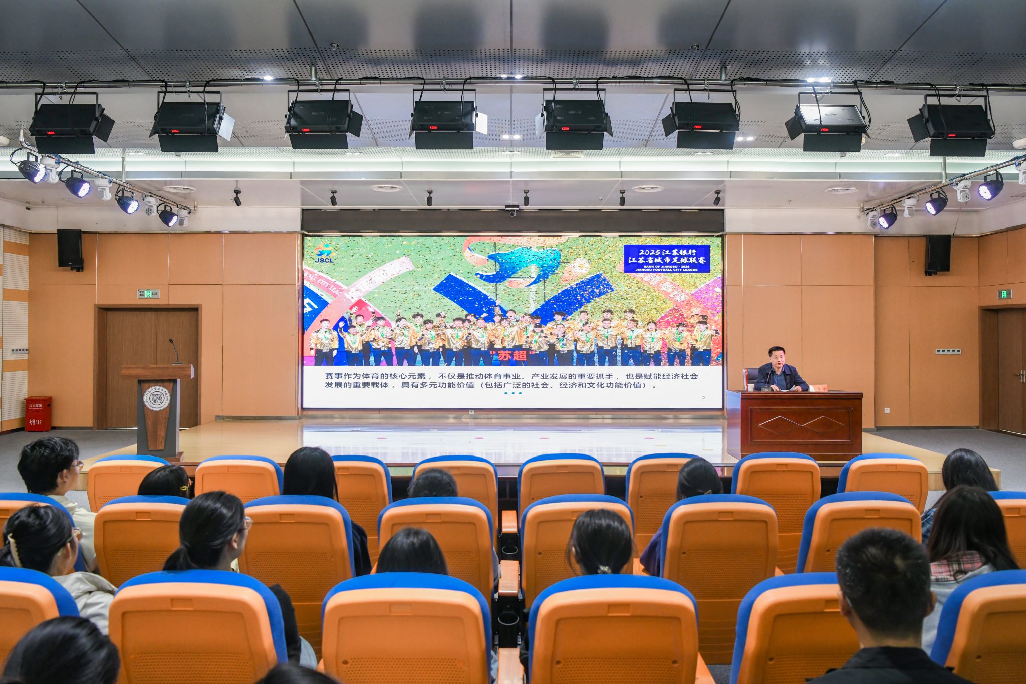 为深入贯彻新发展理念,推动体育产业与人才培养深度融合,引导青年学子把握时代发展脉搏,11月5日,京江学院特邀江苏省体育局党组成员、副局长张海涛在学术交流中心第四报告厅以《发挥“苏超”牵引撬动作用 培育赛事经济 释放消费活力》为题,为300余名师生代表带来了一堂兼具理论深度与实践温度的专题思政课。