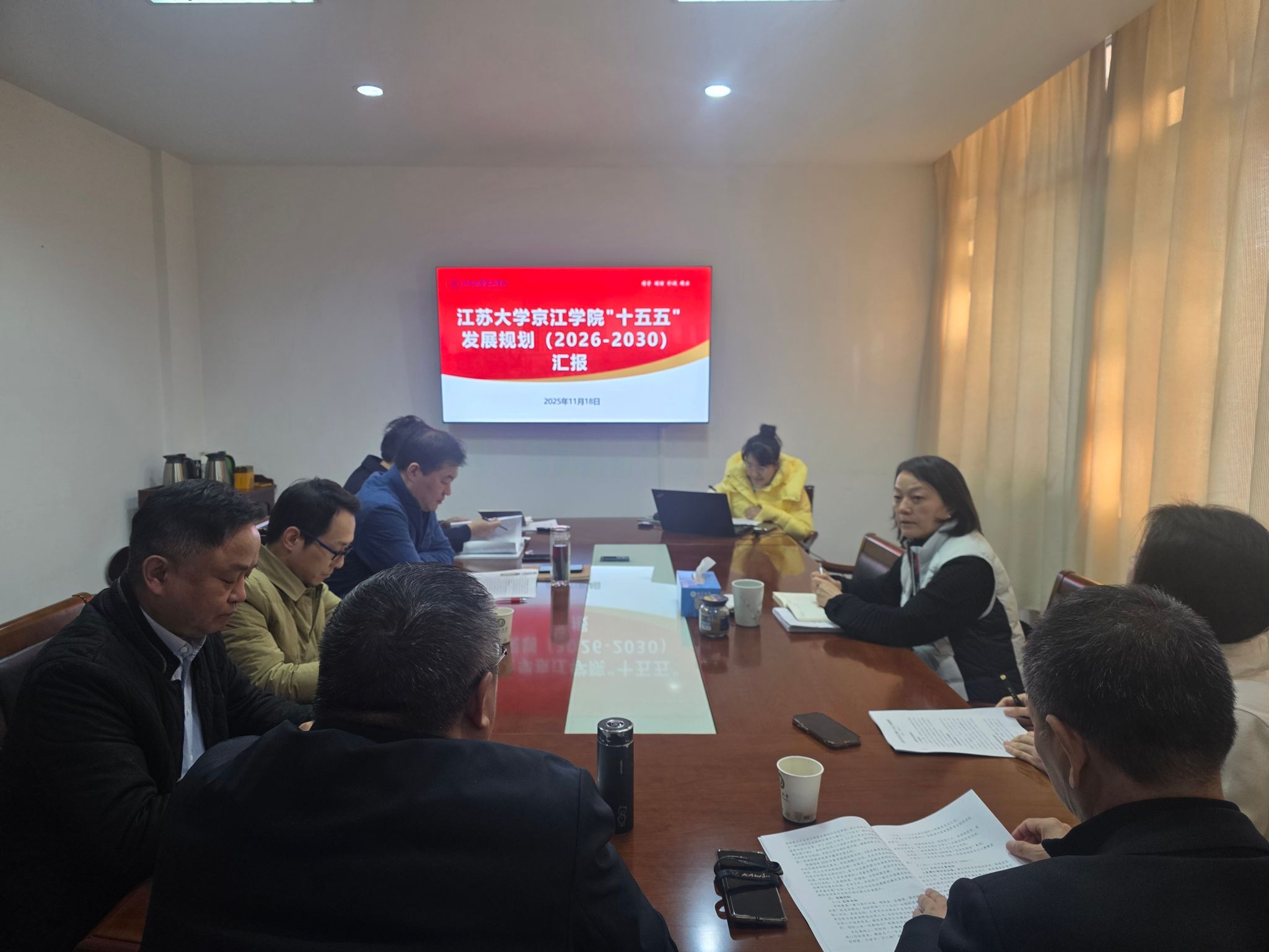 11月18日,江苏大学副校长陈红在江苏大学行政1号楼309会议室听取京江学院“十五五”发展规划编制进展汇报,京江学院全体院领导、相关职能部门负责人参加会议。
