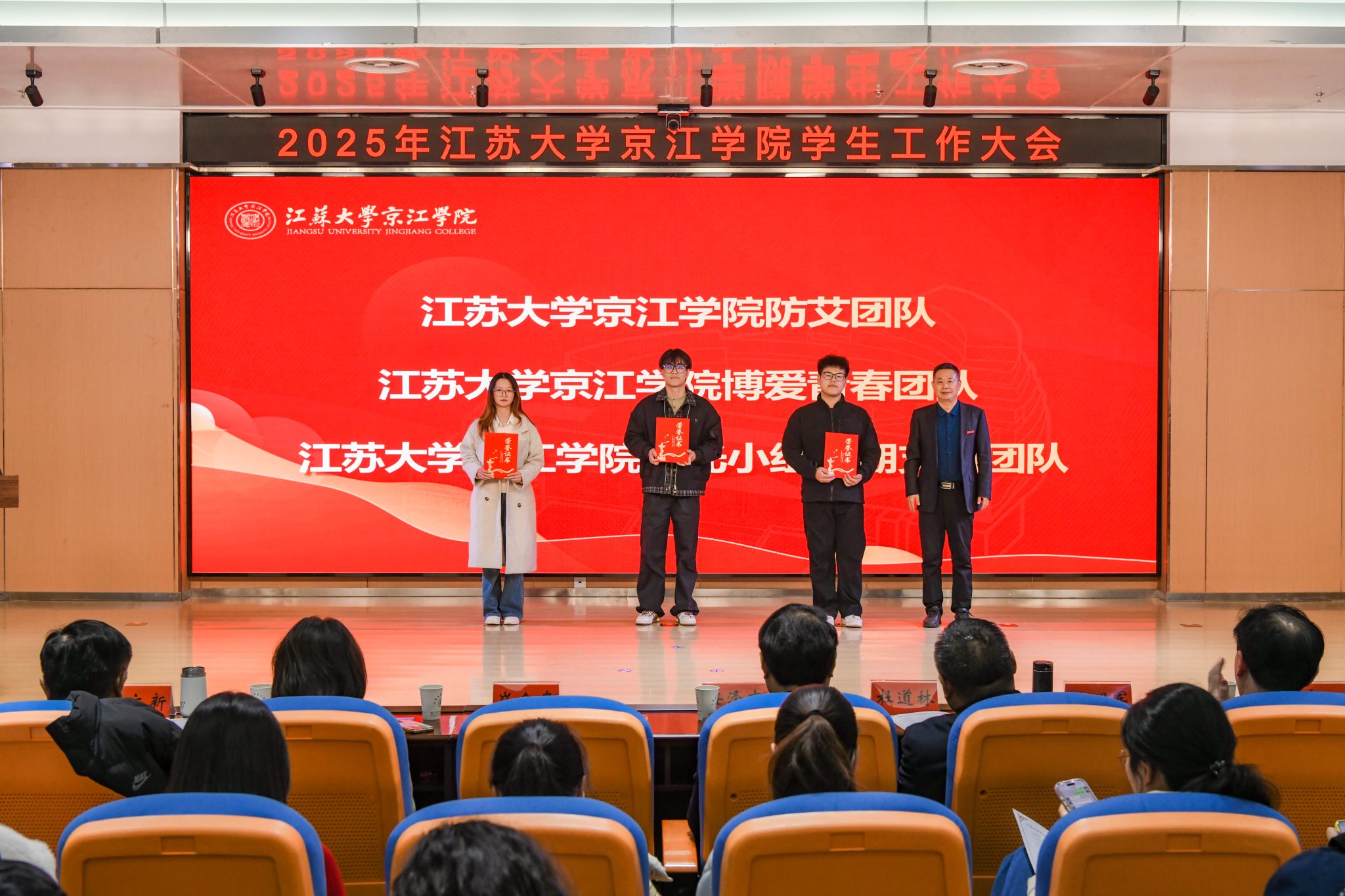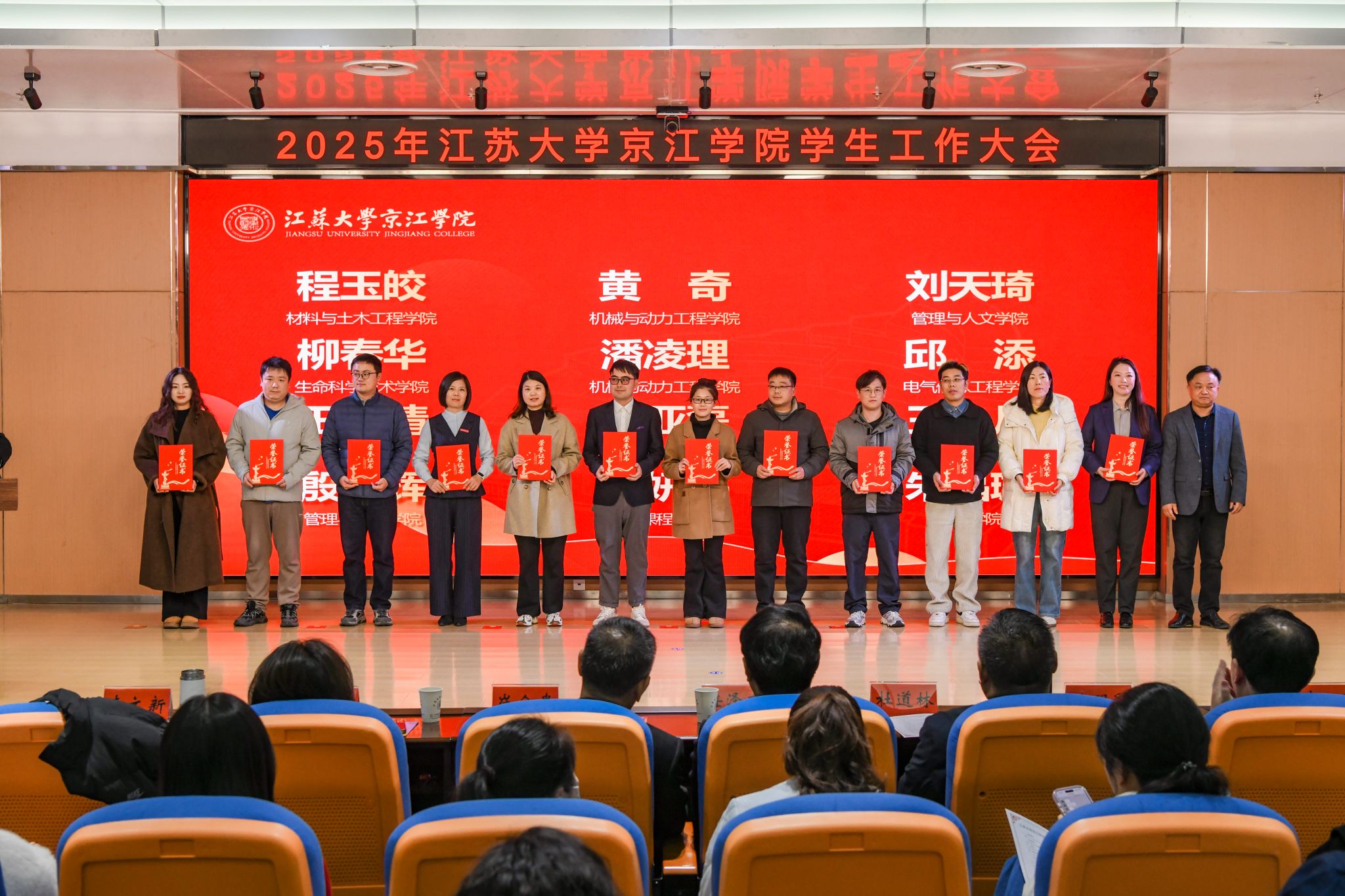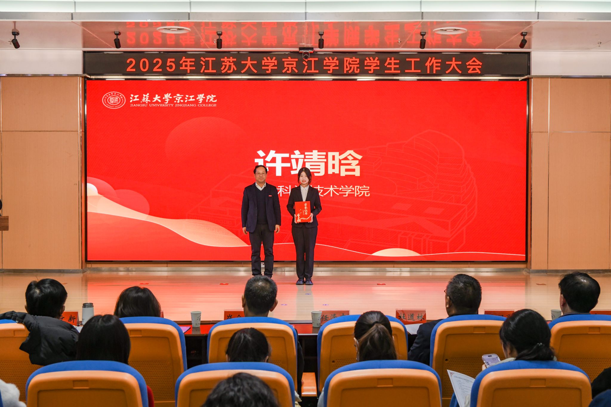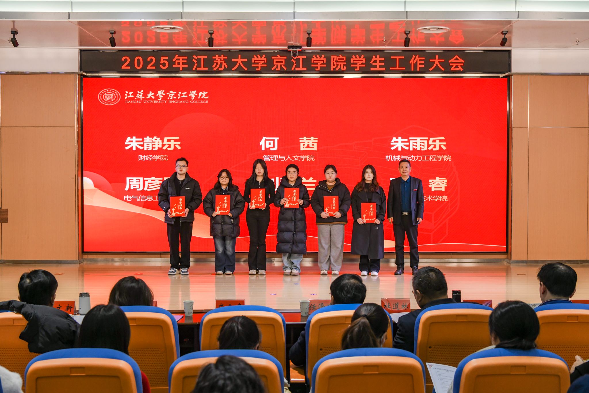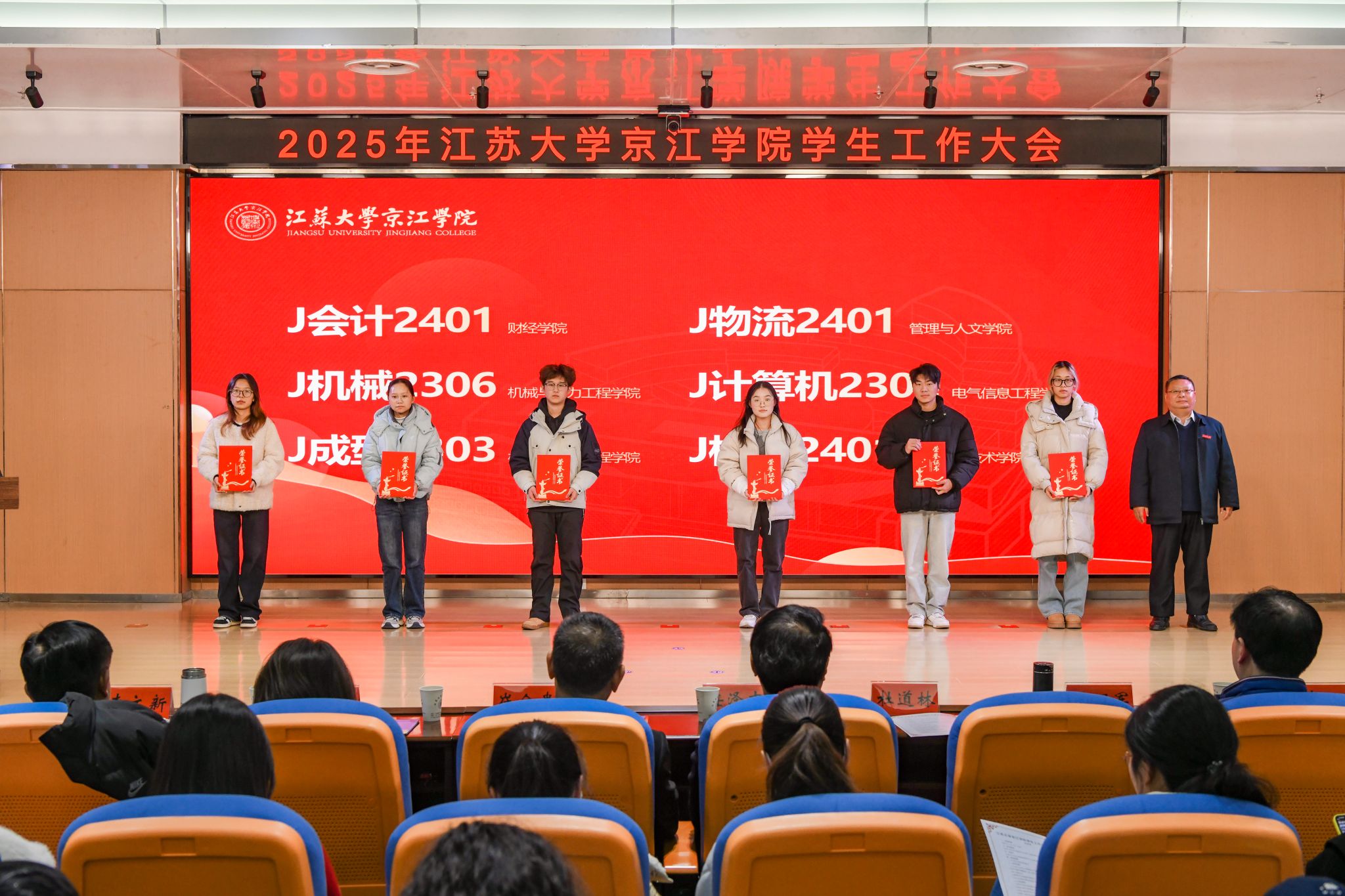 大会对在学生工作中表现突出的集体和个人进行了表彰。先后颁发了2025年度社会实践先进个人、2024-2025学年院长奖学金、2024-2025学年学生优秀共产党员代表、2024-2025学年江苏大学校长奖章、2024年度就业工作先进个人、2024年度优秀辅导员、2024-2025学年先进班集体和2025年度社会实践先进集体。