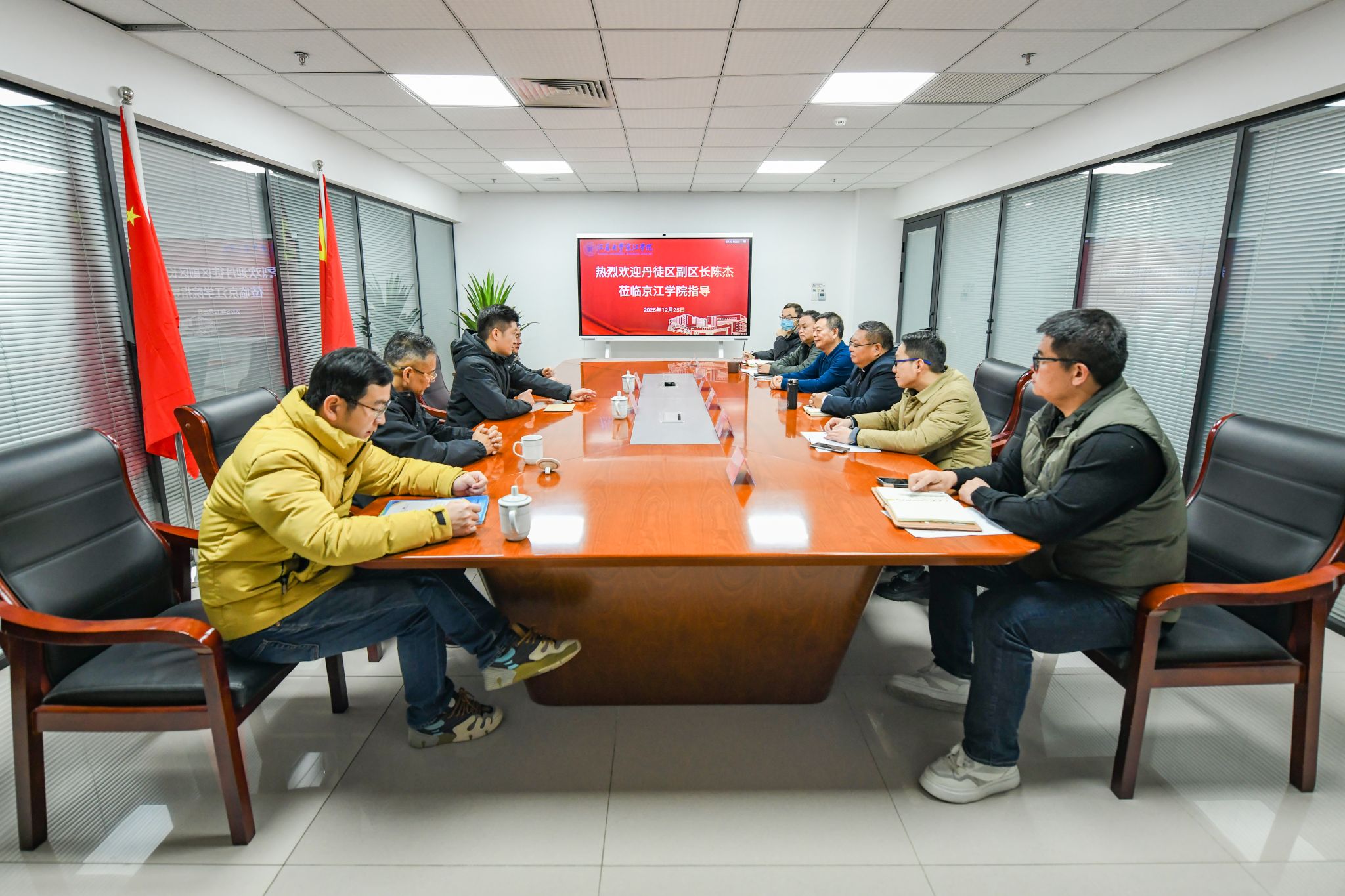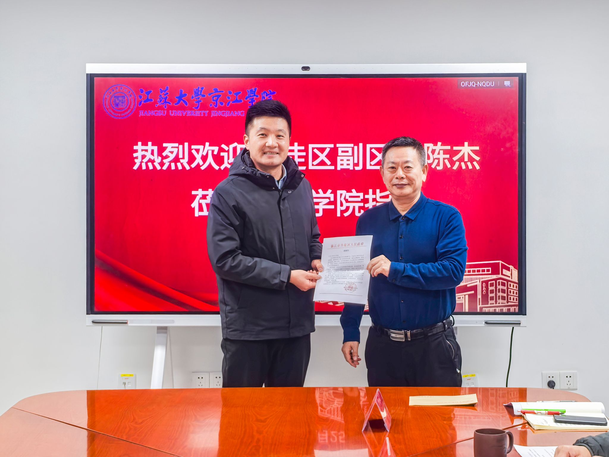 2025年12月25日,丹徒区副区长陈杰一行代表区政府向京江学院赠送感谢信。京江学院党委书记崔金贵,院长杜道林接待了陈杰一行,副院长李文新,相关职能部门负责人陪同接待。