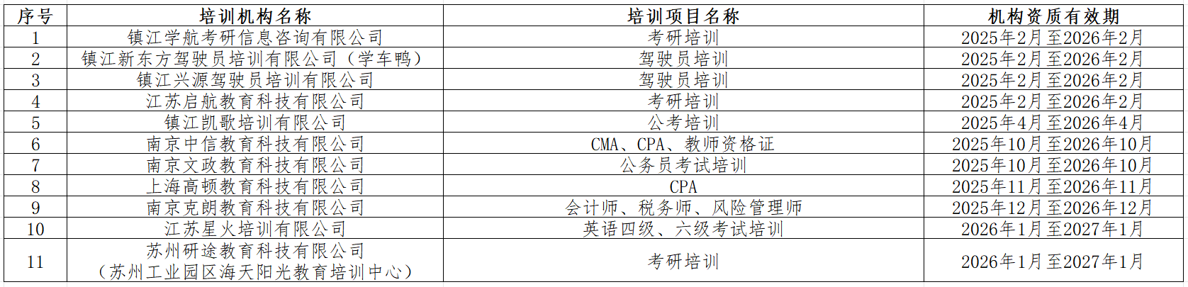 为加强对培训机构的规范管理,保障学校正常的教学、生活秩序,维护学生的合法权益,学生工作部对符合相关规定的培训机构及项目进行资格审核,现将2026年符合相关规定的培训机构及培训项目名单公布如下: