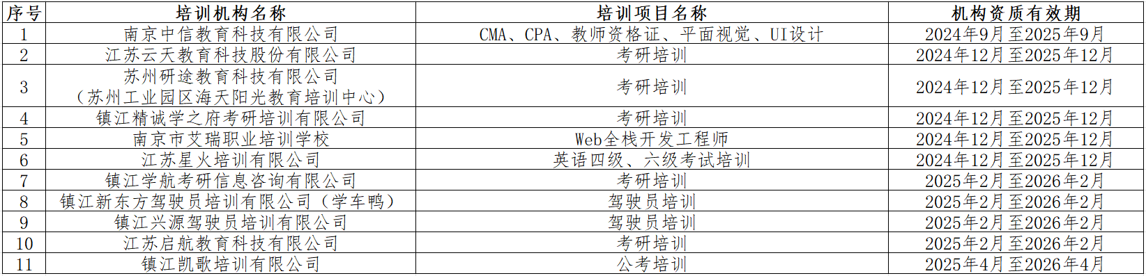 为加强对培训机构的规范管理,保障学校正常的教学、生活秩序,维护学生的合法权益,学生工作部对符合相关规定的培训机构及项目进行资格审核,现将2025年符合相关规定的培训机构及培训项目名单公布如下: