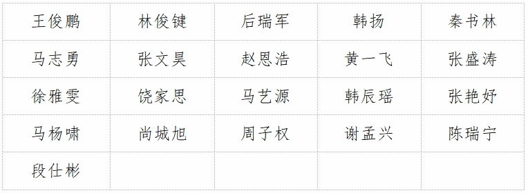在军训期间,涌现出一大批刻苦训练的先进个人,为表彰先进、树立榜样,学院决定对获奖的先进个人予以表彰。表彰名单如下: