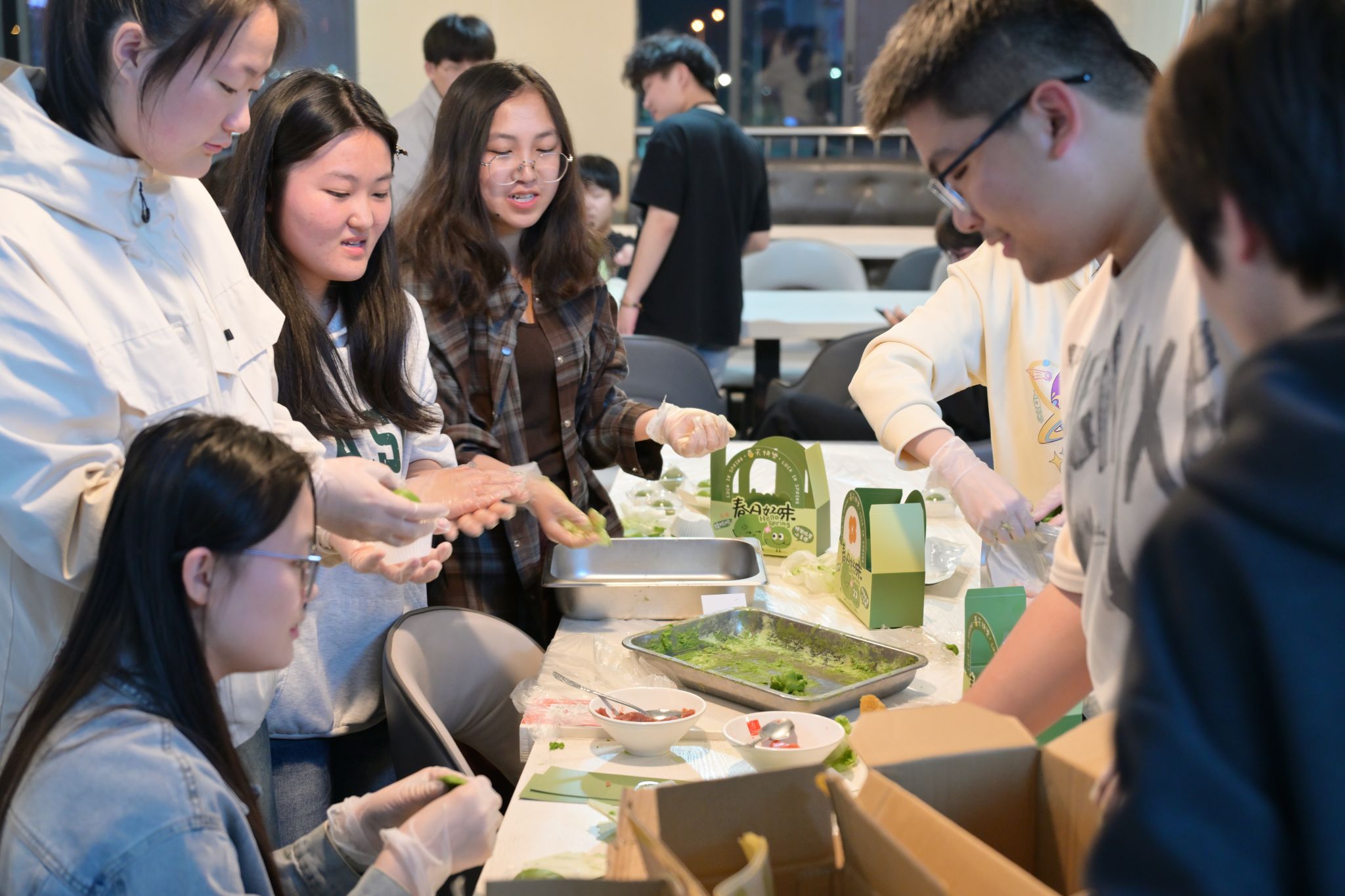活动现场,同学们戴上手套,将碧绿的艾草面团揉搓成小碗状,填入香甜的馅料,再小心收口、搓圆。虽然不少同学是第一次制作青团,但在相互协作与工作人员的指导下,逐渐掌握了技巧。一个个圆润可爱的青团整齐码放在托盘中,现场洋溢着艾草的清香与劳动的喜悦。