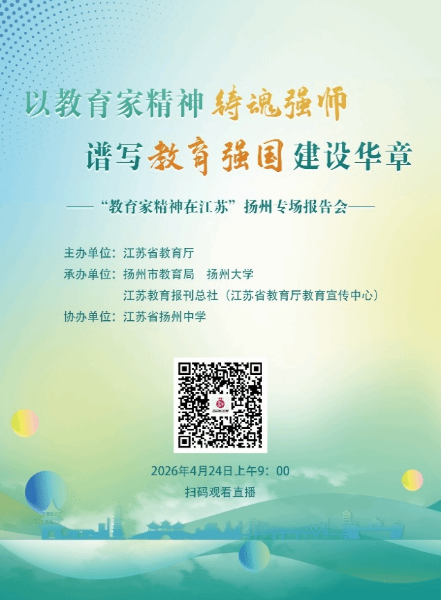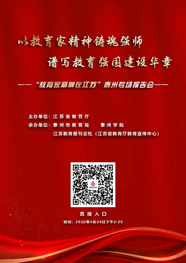 为深入学习贯彻习近平总书记关于教育的重要论述,大力弘扬新时代教育家精神,激励广大教师践行教育家精神,省教育厅将于2026年4月24日在扬州市、泰州市分别举办“教育家精神在江苏”专场宣讲会。根据上级主管部门要求,现就组织我院教职工线上收看学习有关事项通知如下: